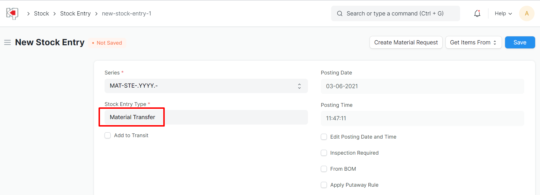 Now enter the date time and then select the Source Warehouse and Target Warehouse ( transfer from 1 to 2) also select the item and quantity to be transferred.