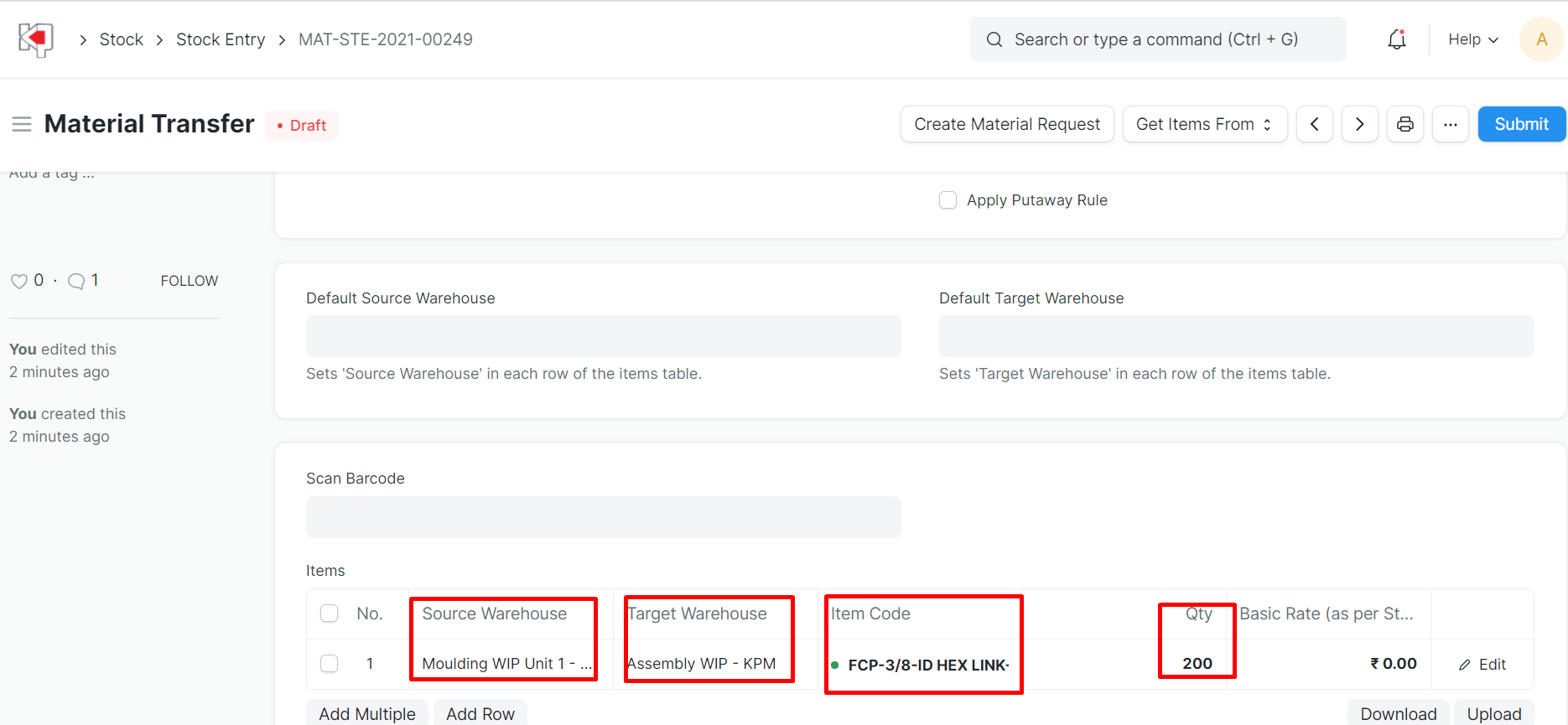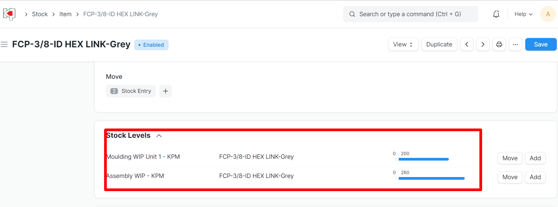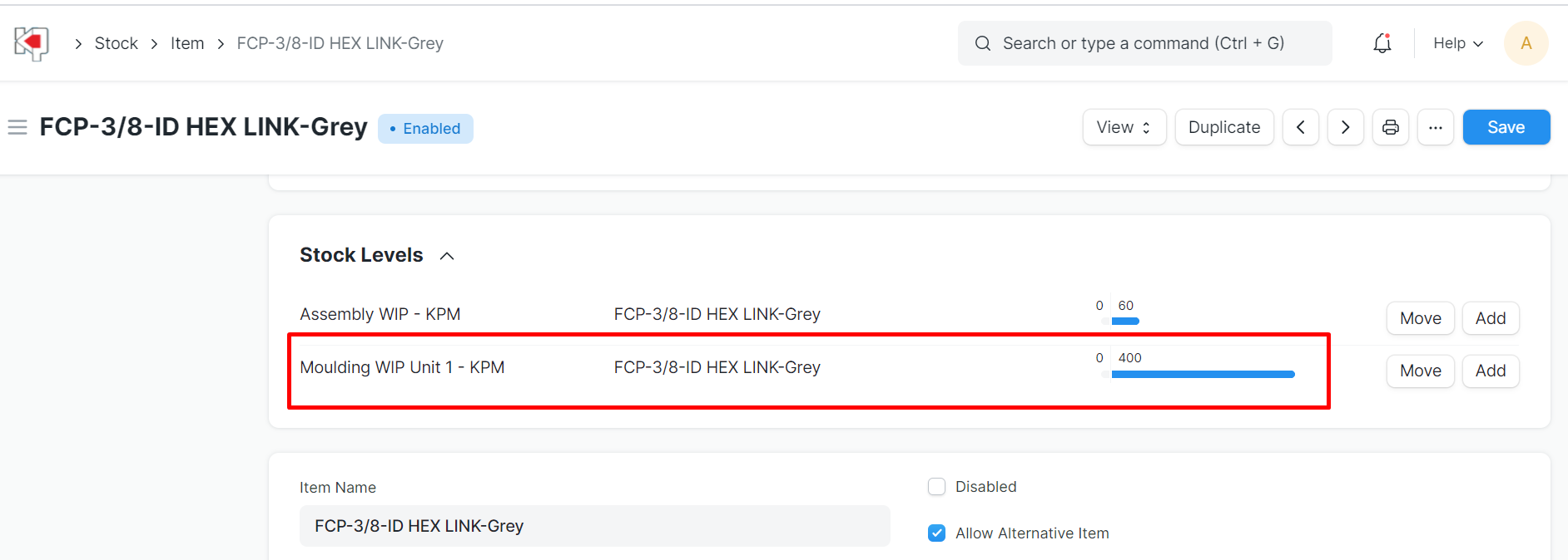 In this case, we want to transfer item from "Moulding WIP Unit 1 - KPM" to "Assembly WIP-KPM"